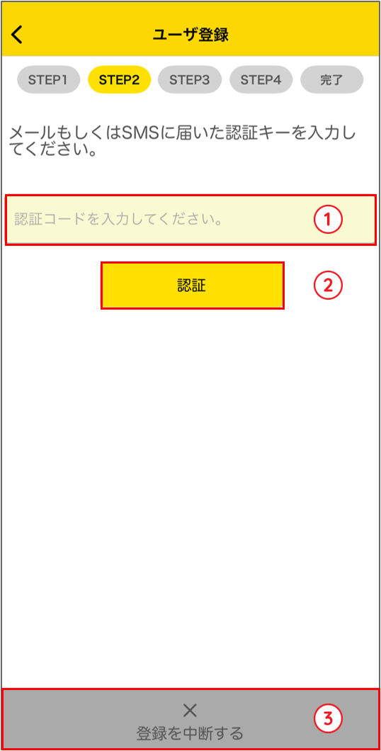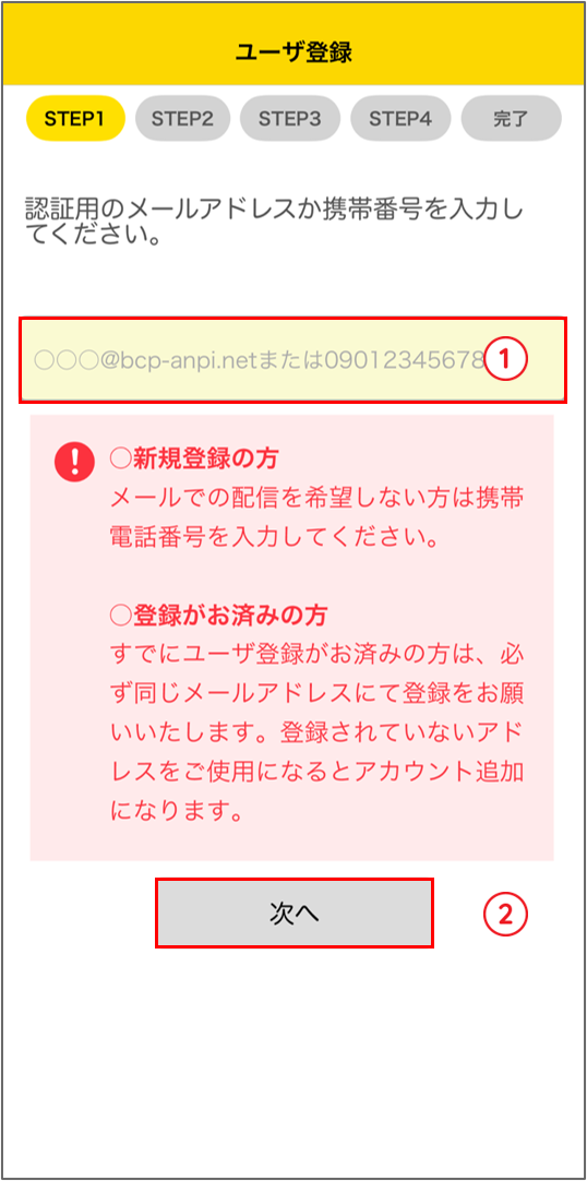 タップするとSTEP1「メールアドレスまたは携帯電話番号の入力画面」に戻ります。