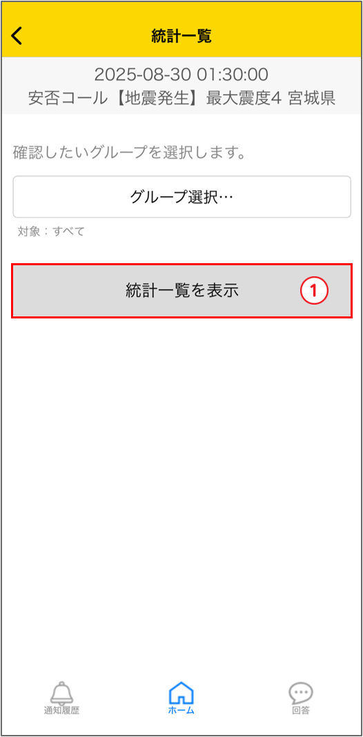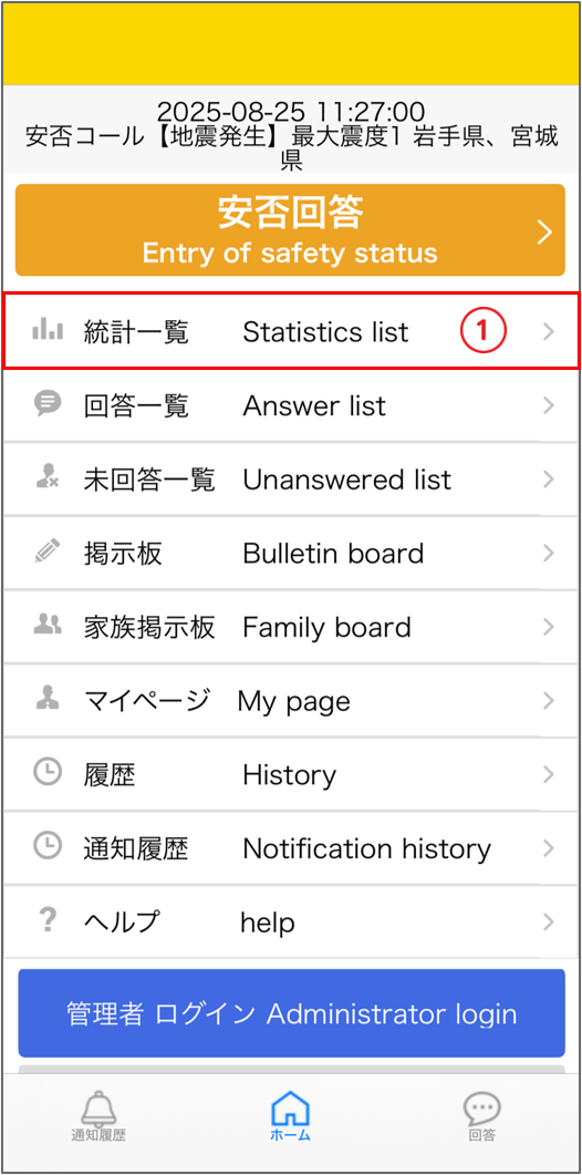 ホーム画面にある「統計一覧」をタップすると、統計一覧画面に遷移します。