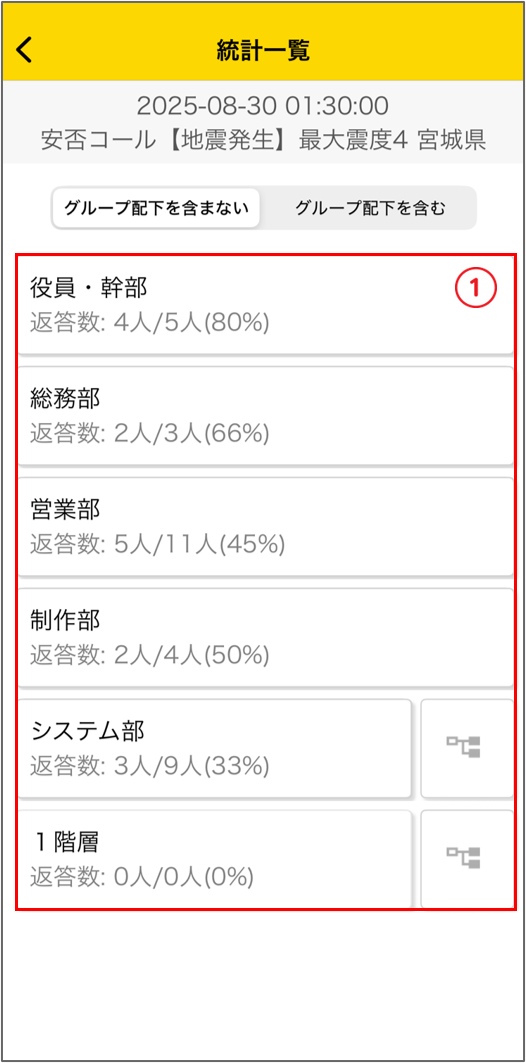 選択したグループの集計結果が表示されます。各項目をタップすると、詳細内容が閲覧できます。