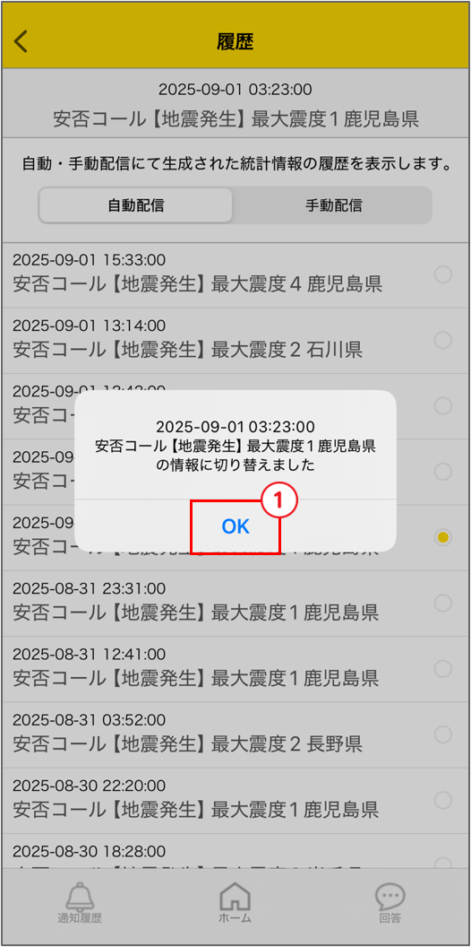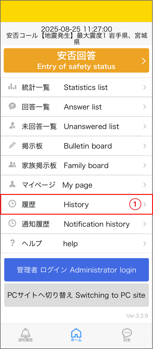 履歴で配信を選択することにより、統計一覧、未回答一覧、回答一覧、安否回答に反映されます。