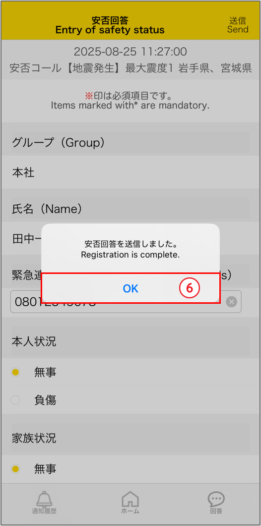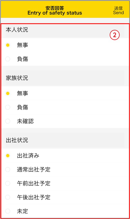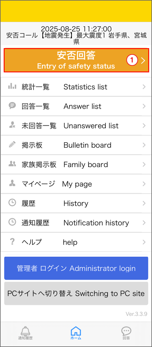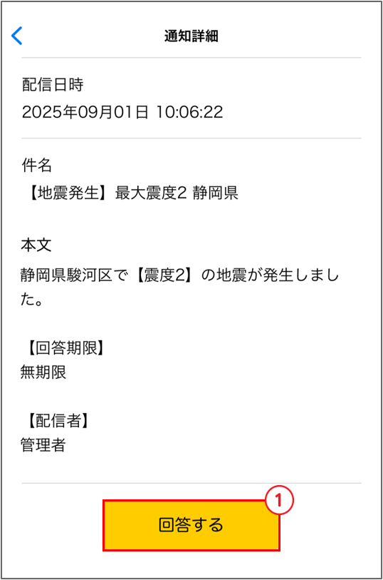 「安否回答」ボタンをタップすると、安否回答ページへ遷移します。