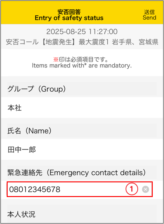 「緊急連絡先」は既に登録している番号が自動で入力されます。