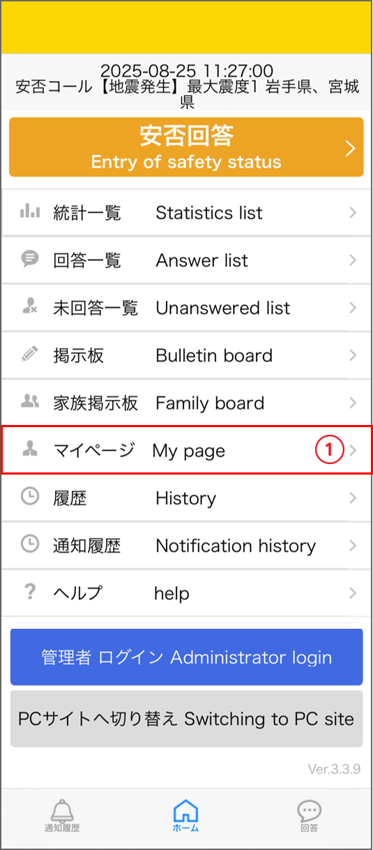 ホーム画面「マイページ」をタップ